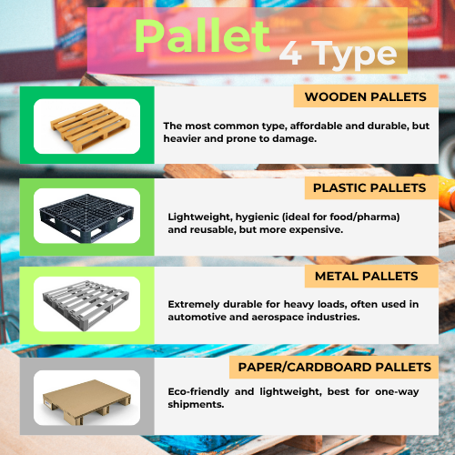 1. Product: Each type of pallets have different load bearing capacities. So, should choose the type of pallet that is suitable for your product. Moreover if the product need to be stored in temperature-controlled room/warehouse, the pallets should also moisture resistant.